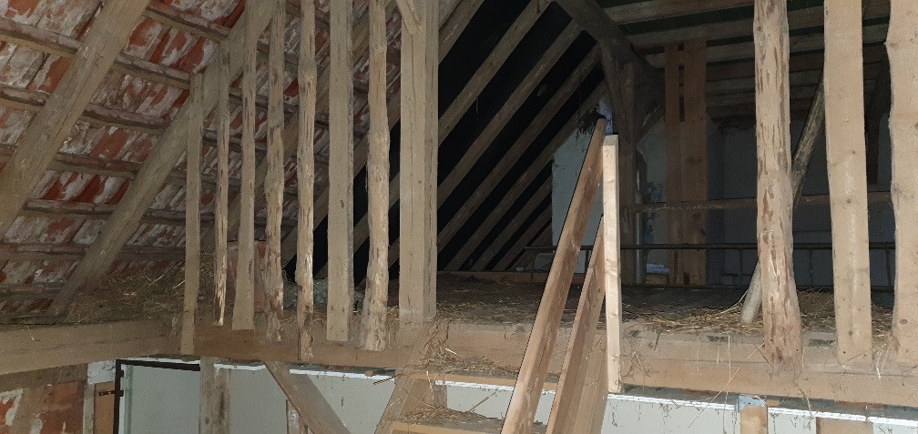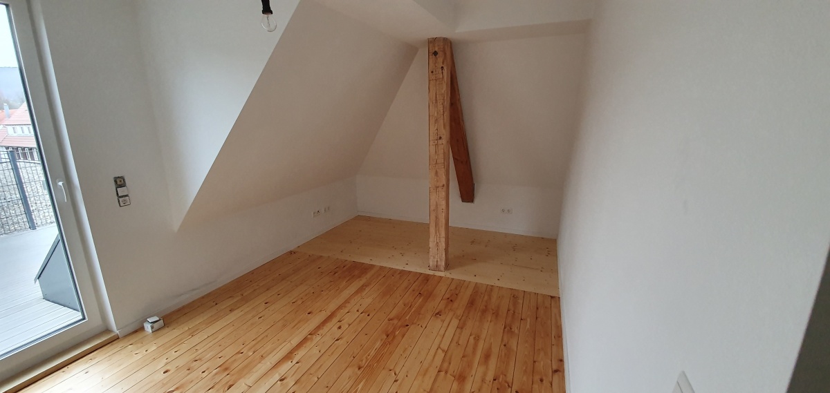 Die tragenden Balken im Dachgeschoss wurden freigelegt und sichtbar gelassen.